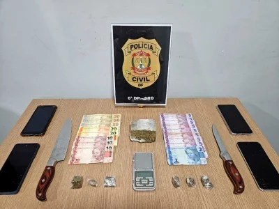 Após a abordagem aos usuários, as equipes retornaram ao local e realizaram a prisão de dois suspeitos. Com um deles, foram encontrados dinheiro em espécie e um aparelho celular. Com o segundo, além de dinheiro e celular, havia quatro porções de maconha. Em diligências às respectivas residências dos abordados, os policiais encontraram uma balança de precisão, uma porção grande da droga e outros três aparelhos celulares.