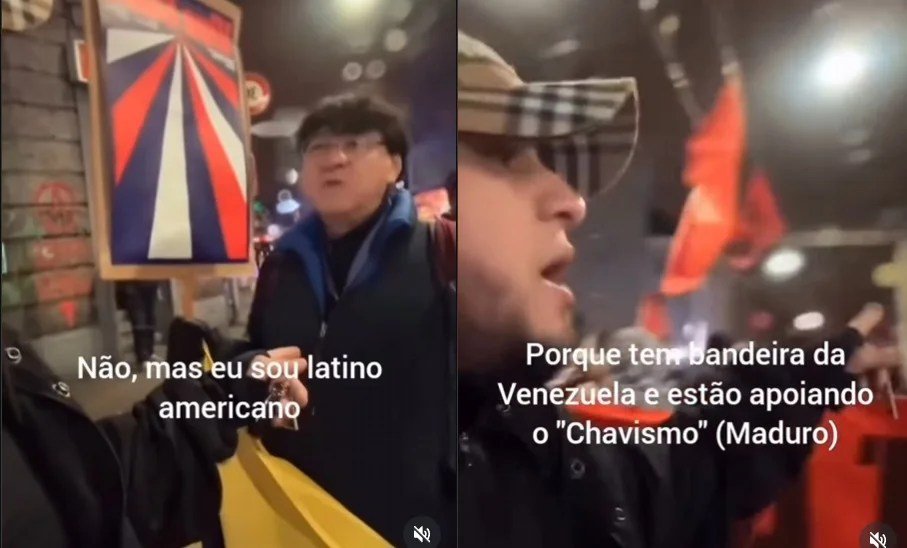 As imagens mostram o momento em que a discussão se intensifica, com o venezuelano elevando o tom ao defender que símbolos nacionais não sejam usados em atos organizados por estrangeiros em apoio ao regime.